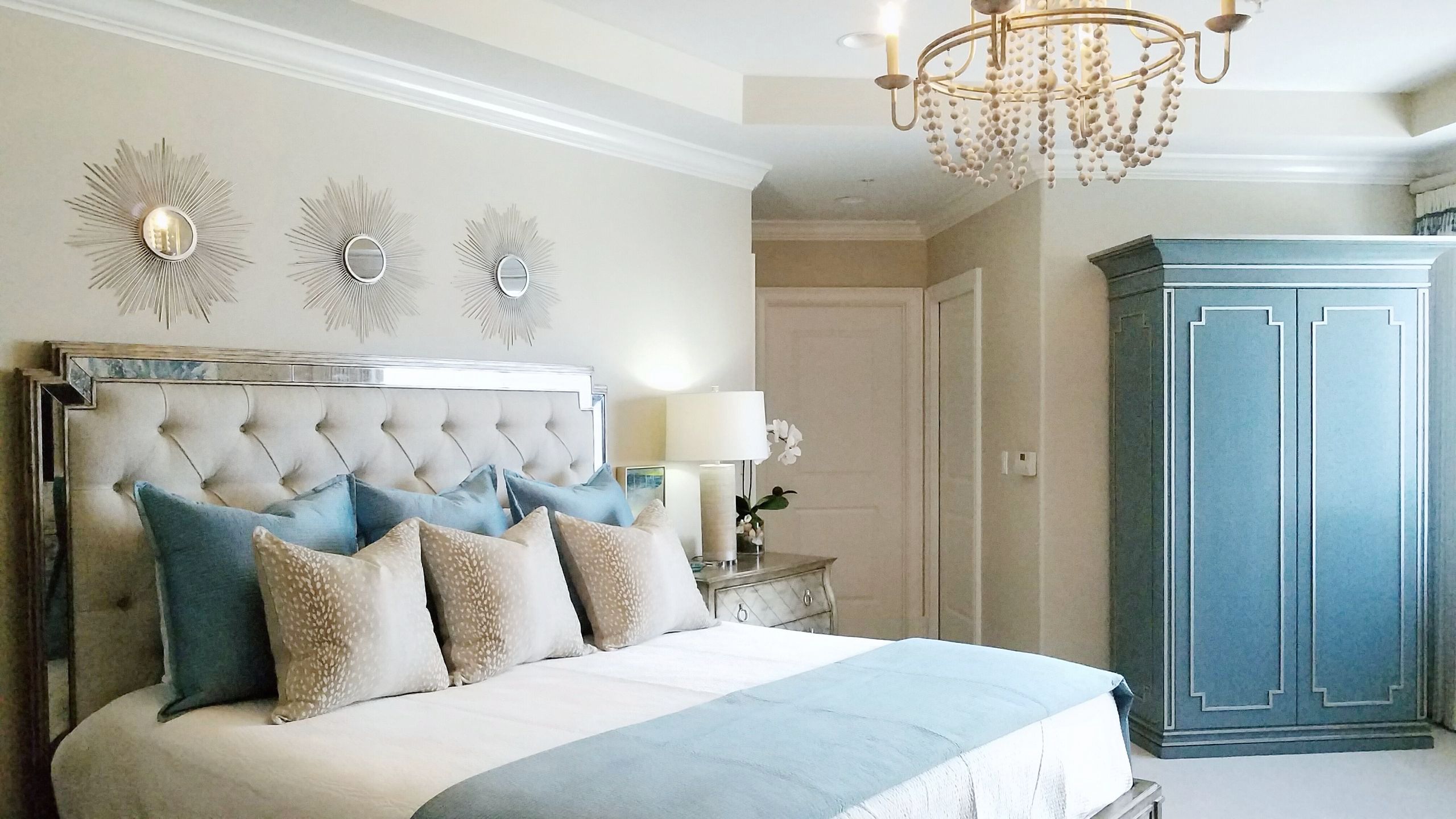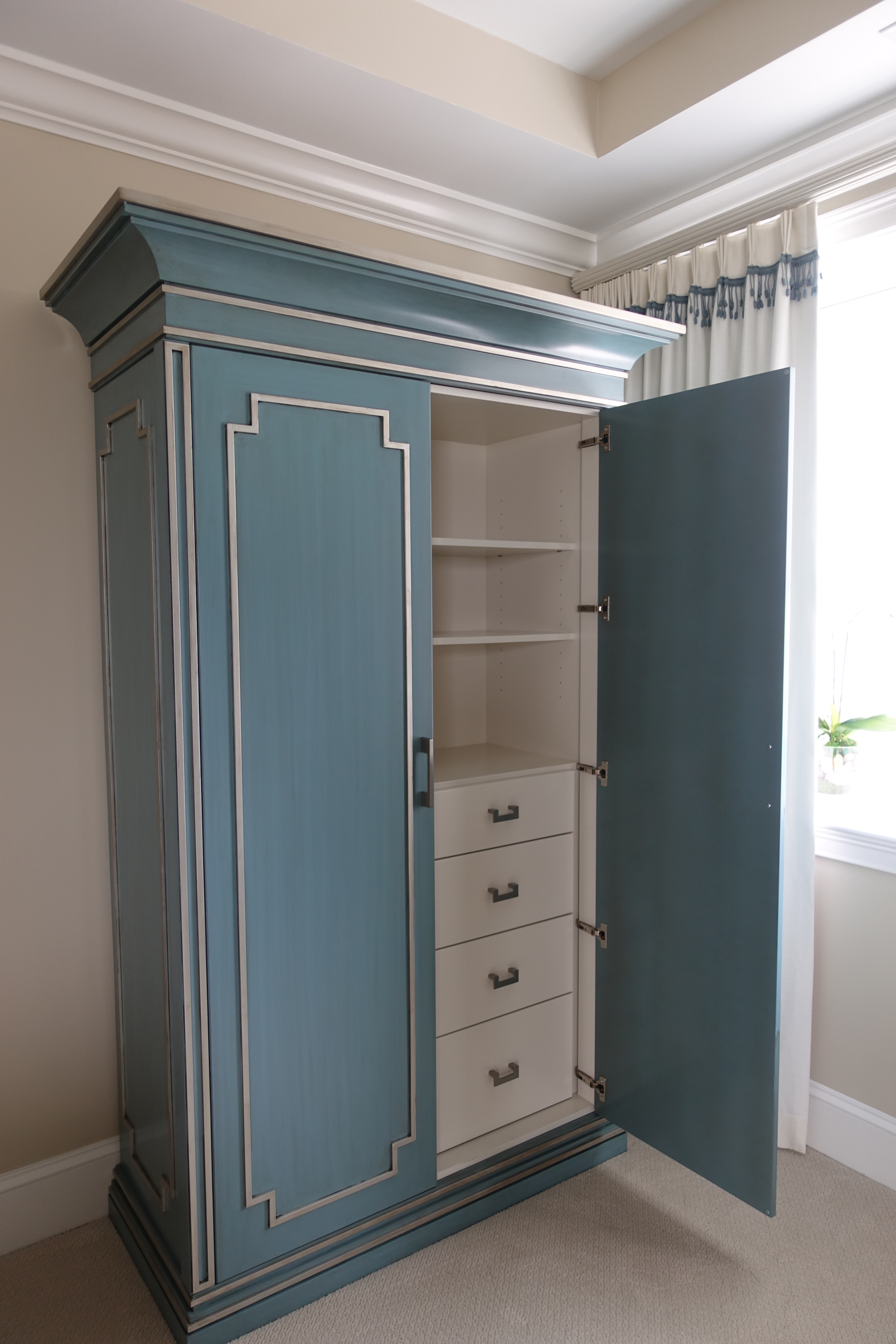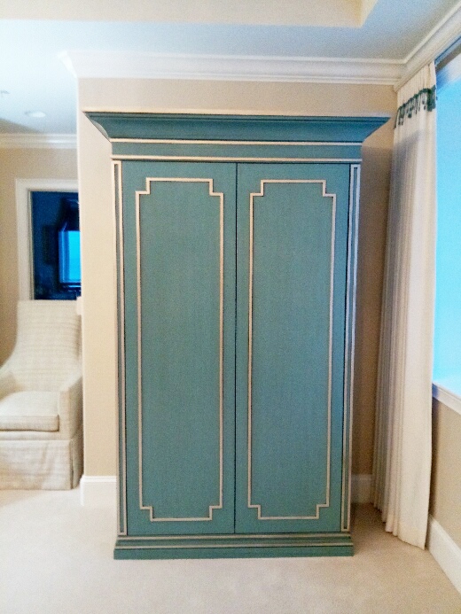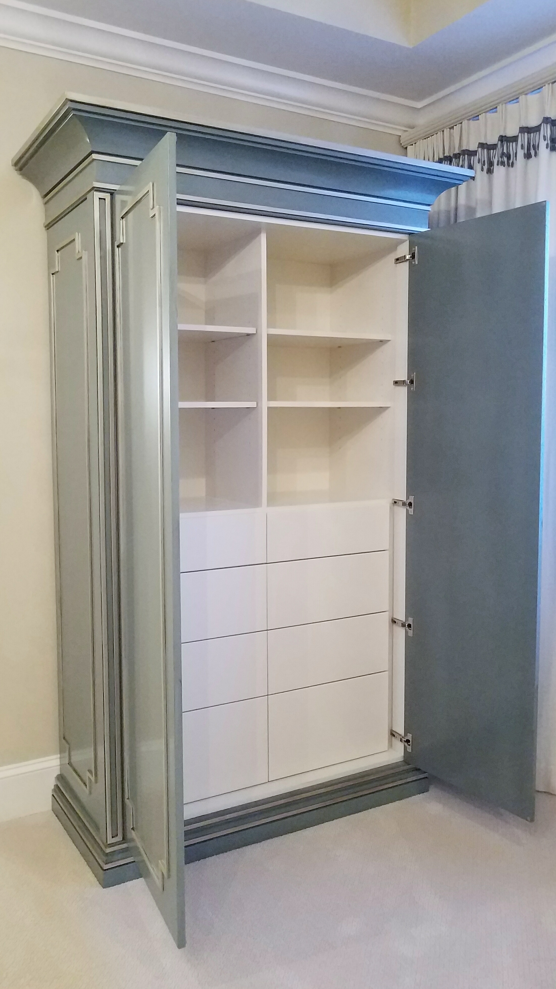 Inspired by a custom walk-in closet my client once saw and loved, I designed this gorgeous armoire to compliment the traditional furnishings in their master bedroom. The exterior is adorned with elegant detailing and the interior with a combination of drawer and adjustable shelving. The finishes were expertly applied with incredible care and by a local furniture maker. Their work exceeded my greatest expectations!