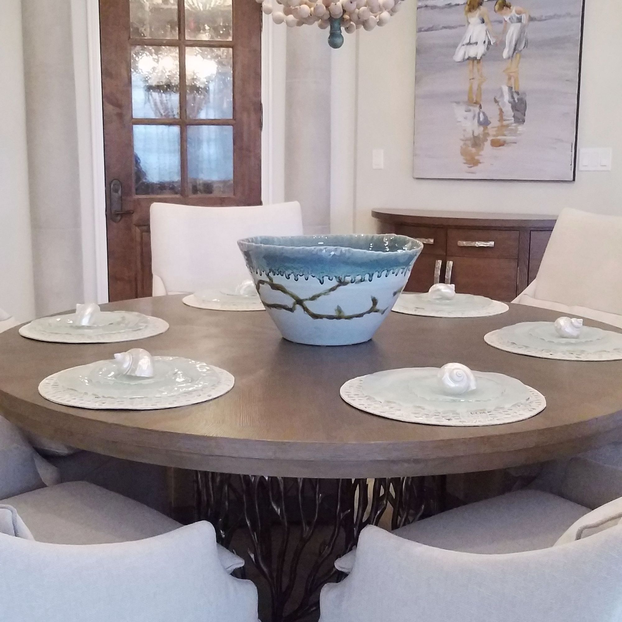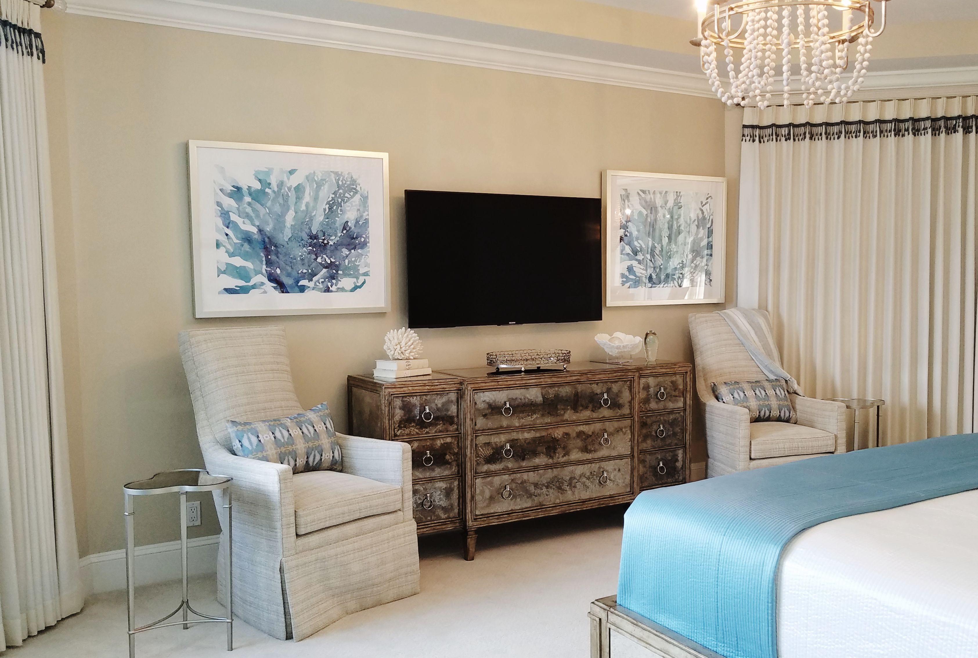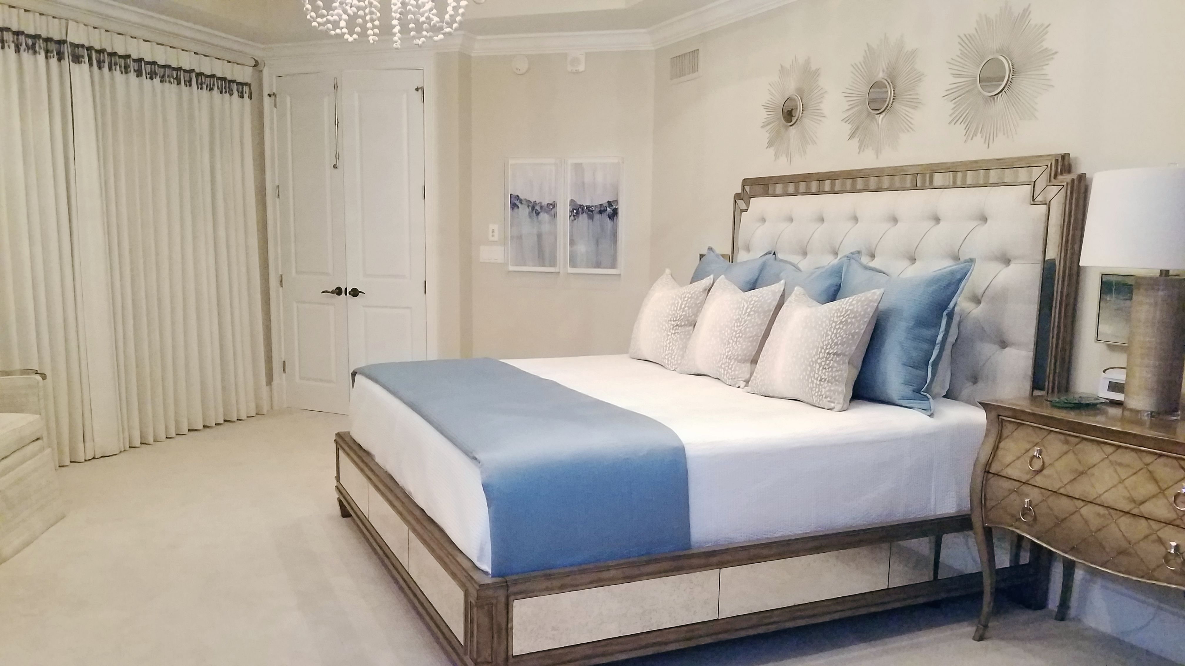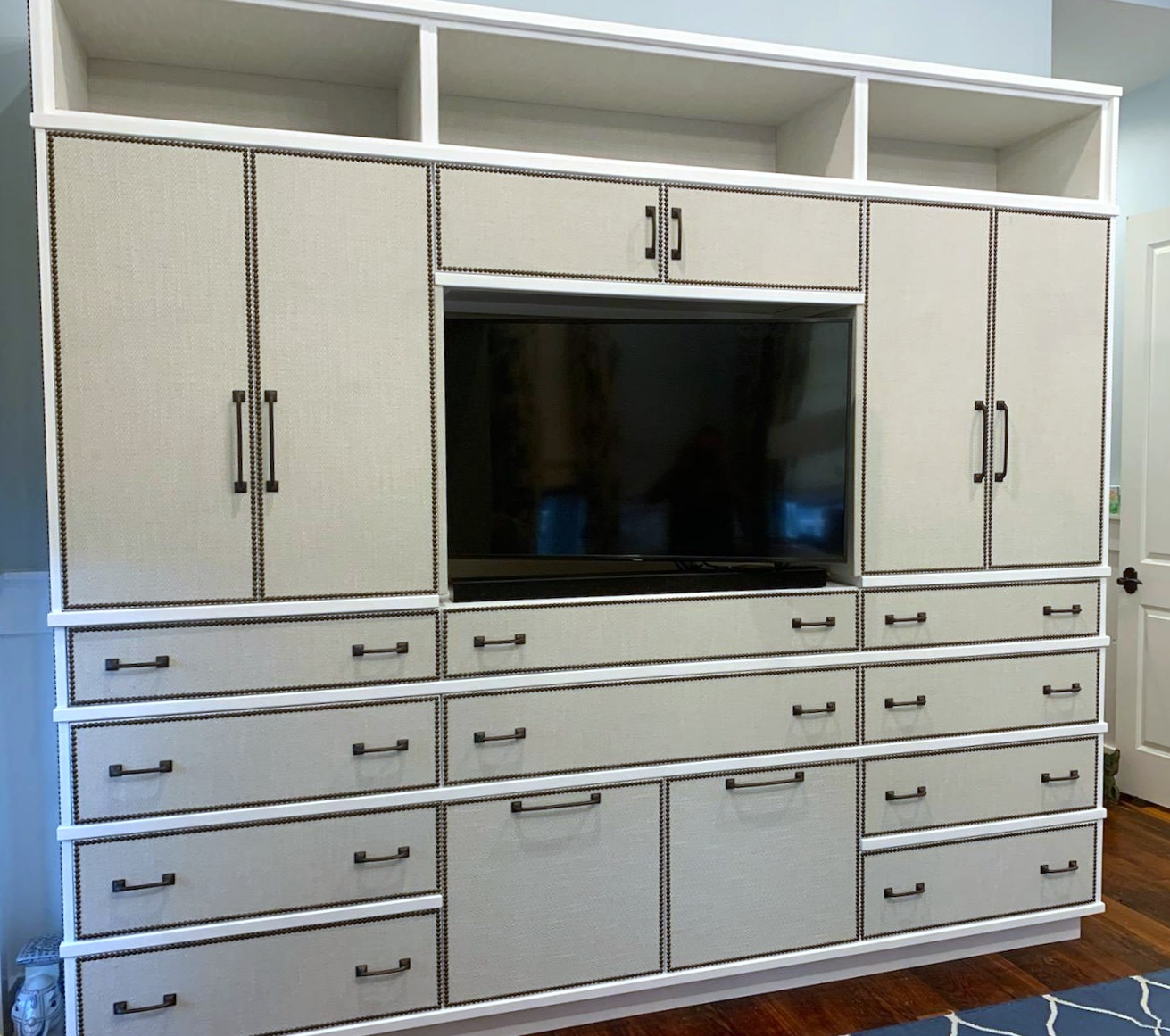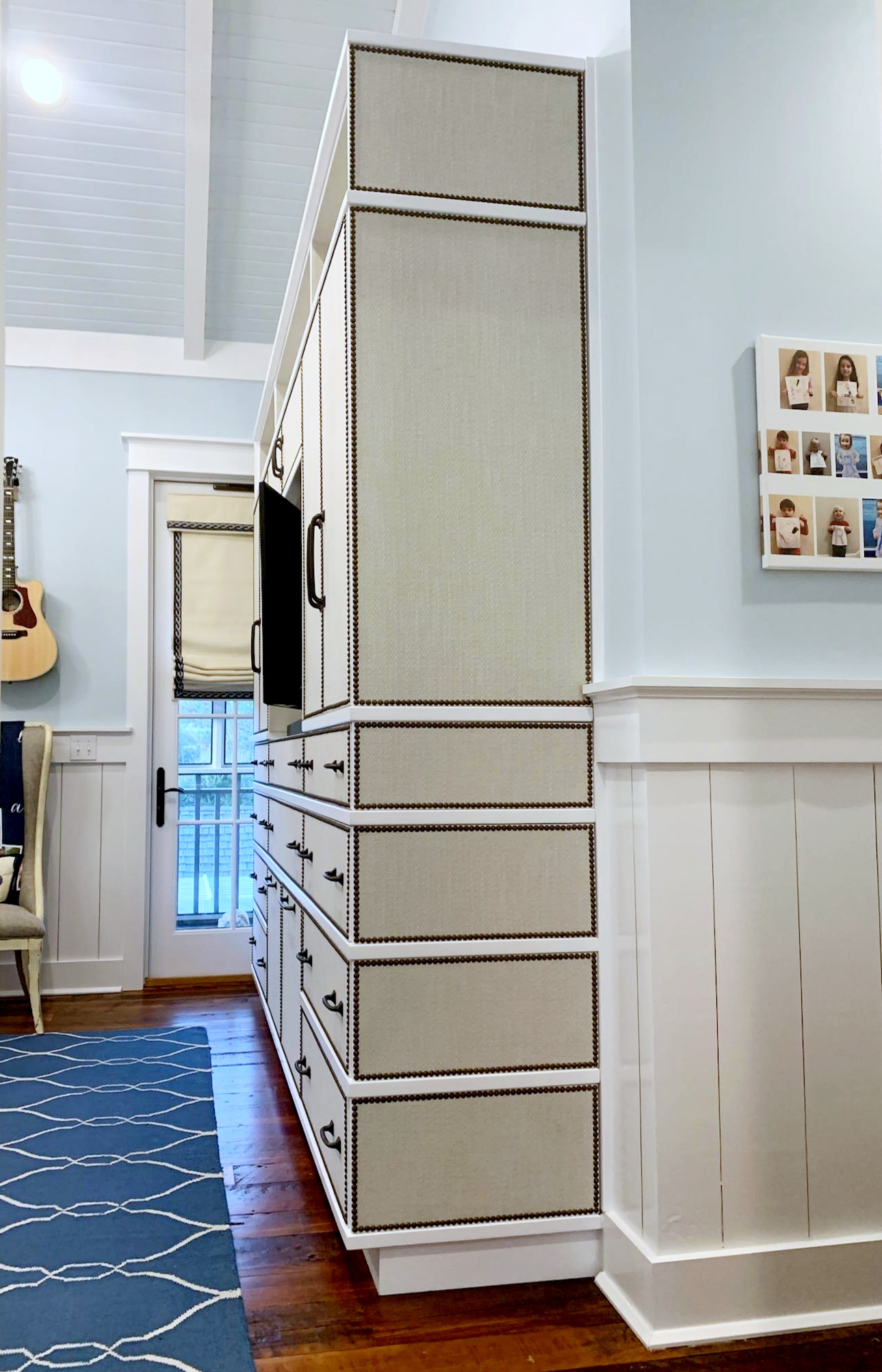This cabinetry was the answer to the lack of storage that is present in so many of our beach homes. The desire was to create maximum storage and functionality, but to incorporate the appearance of steamer trunks. The cabinetry is upholstered in a performance fabric that is easy to maintain.