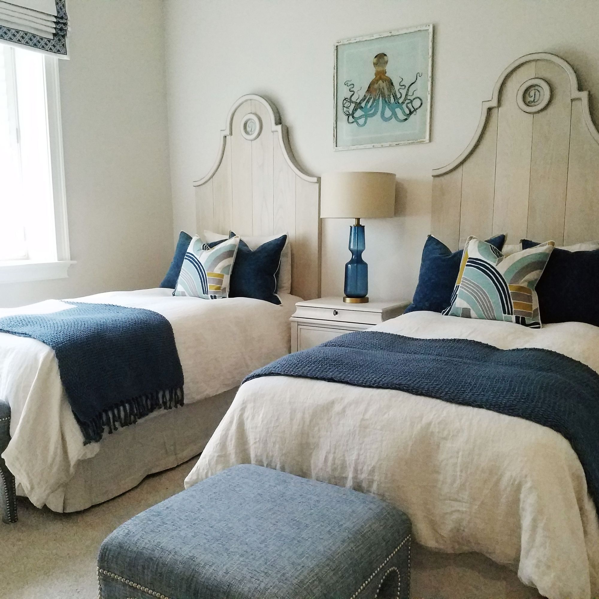 I designed these fun twin headboards for a guest bedroom ready to receive grandchildren. The headboards are securely attached to the wall to prevent injury. A local furniture maker and an artist brought my drawings and intentions to life perfectly!