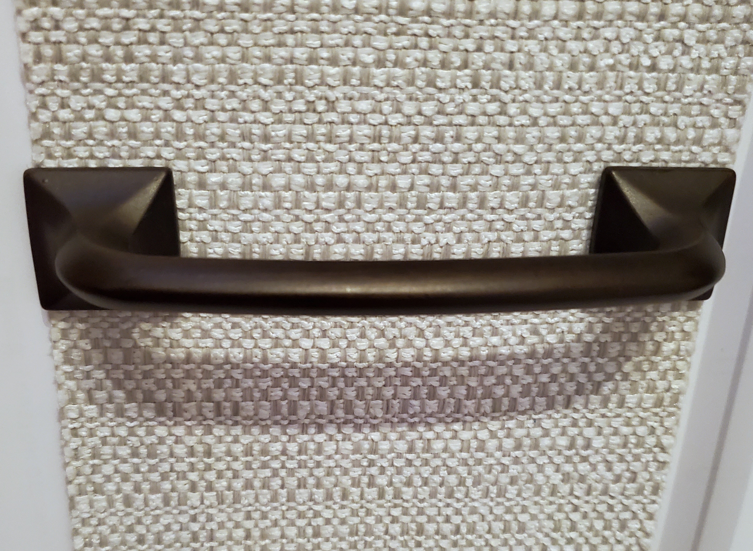 I specified this wonderfully crafted dining table for a client’s dining area, but needed a small complementary cabinet for barware. None was to be found, so I designed this demi-lune cabinet that was expertly executed by a local craftsman incorporating quarter-sawn white oak, banded edge detail, and striking hardware.